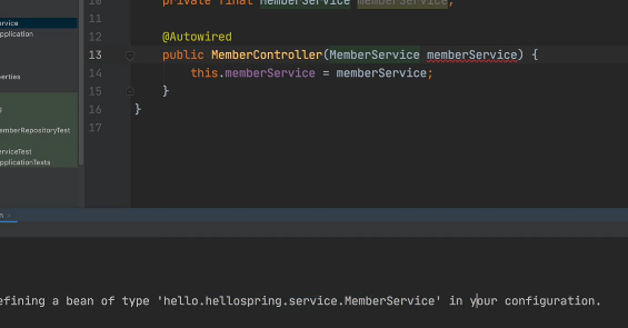 따라서 그냥 두면 컴포넌트 스캔으로 올라가고 @Autowired로 지정해주면 MemberService만 따로 빈에 등록해주어도 자동으로 MemberController에서 MemberService를 인식합니다.