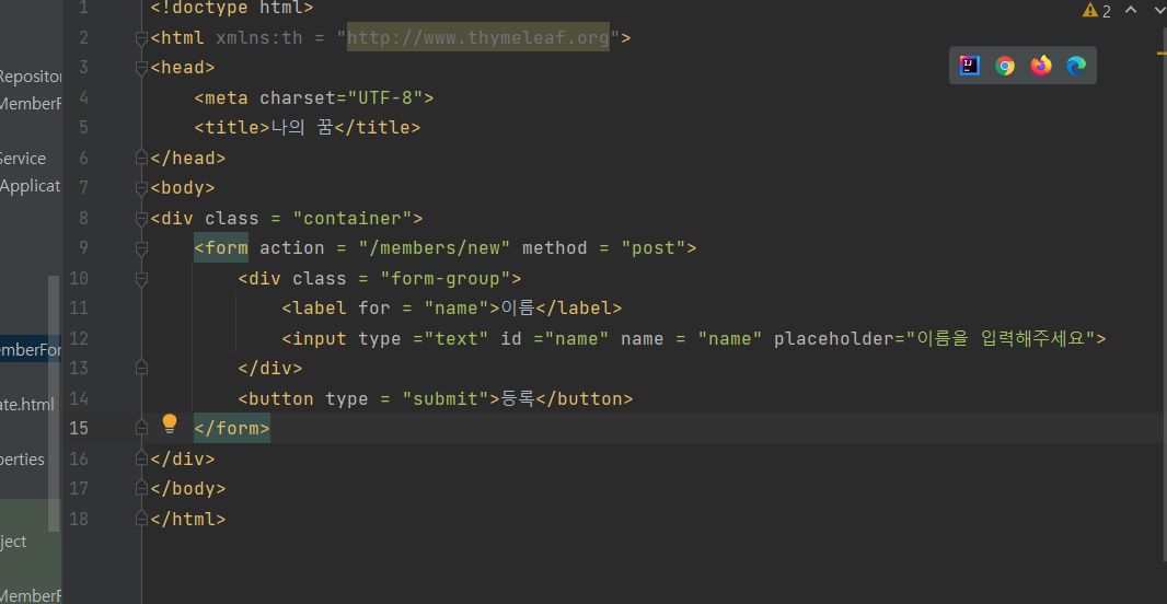 자 이렇게 하면 membersForm.html에 있는 html파일에서 우리가 name을 입력하면 button을 클릭했을 때 submit방식으로 로직을 짰었습니다.