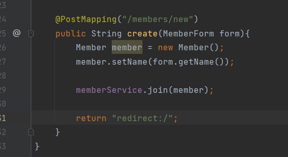 그리고 받아온 name을 MemberForm의 form이라는 생성자를 통해 create에 주입시킵니다.