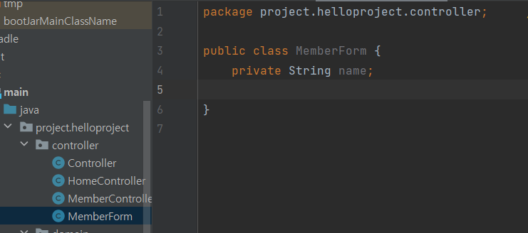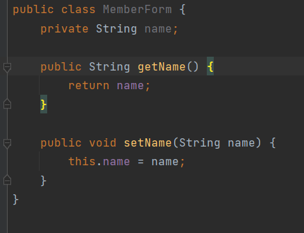 그럼 받아온 name을 MemberForm으로 가져오고 Getter / Setter를 이용하여 name을 유지보수할 수 있습니다.