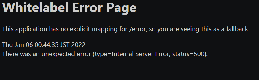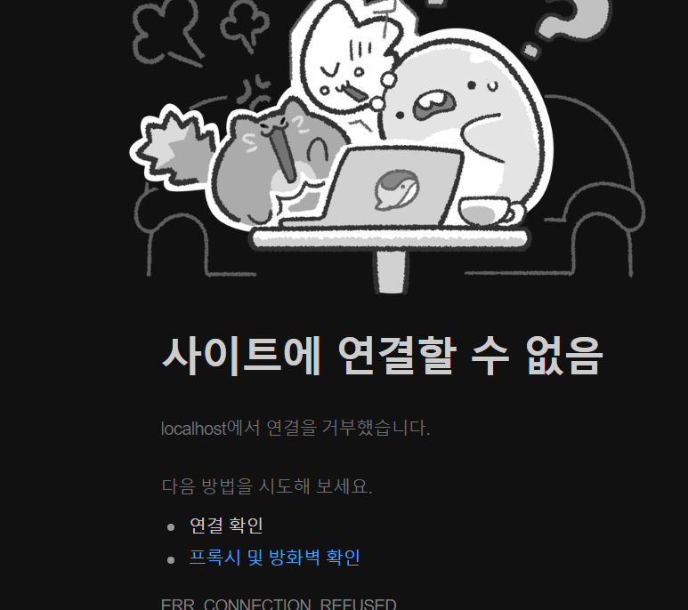 에러가 뜨겠죠?? 아 이건 서버 끄고 실행해서 연결할 수 없음이 뜬건데 아마 여러분들은 Whitellabel Error가 떠야 합니다.