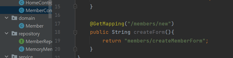 자 그래서 MembersController에 members/new라는 주소로 매핑하여 createForm()이라는 메서드를 만들고 return할 때 members/createMembersForm으로 return합시다.