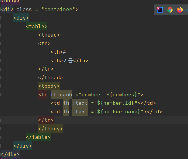 이렇게 th:each라고 입력하면 루프를 돈다고 생각하면 되겠습니다. (타임리프 문법)