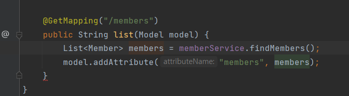 이때 불러온 members들을 List타입으로 가져오므로 List<Member> member라고 생성하여 members에 담습니다.