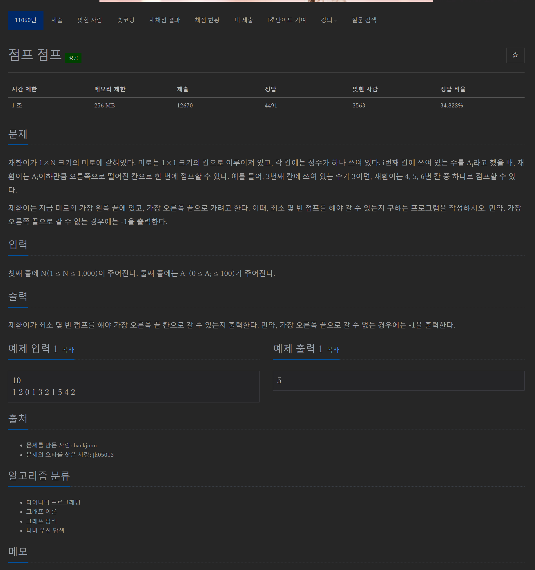 [BOJ - JAVA] 11060 - 점프 점프 (DFS) 본문