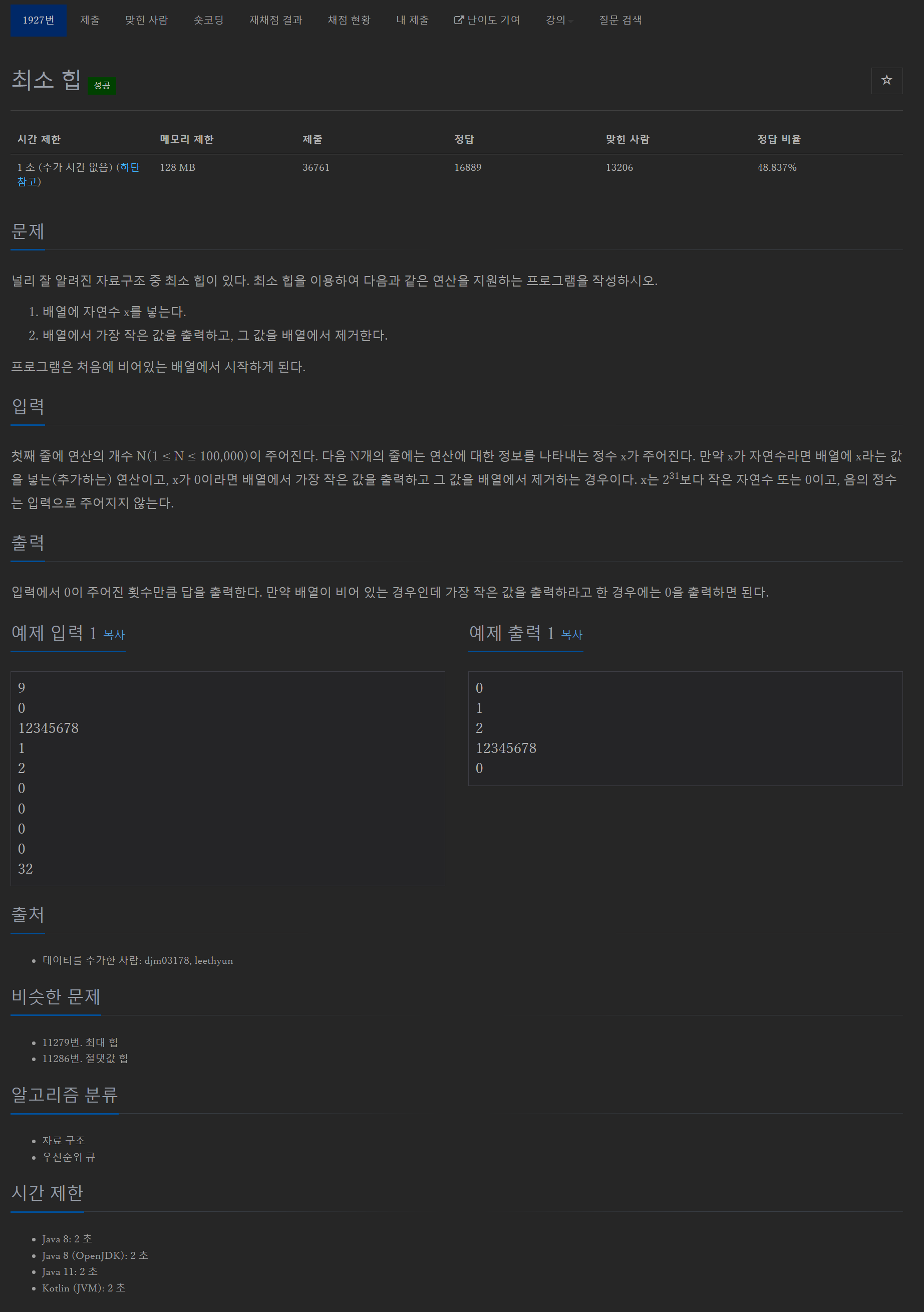 for문을 이용하여 x를 입력받고 x가 0이고 queue가 비어있으면 0출력, 아니면 queue의 최소값 출력을 하고 x가 0이 아니라면 그냥 최소값을 출력하면 정답이 됩니다.