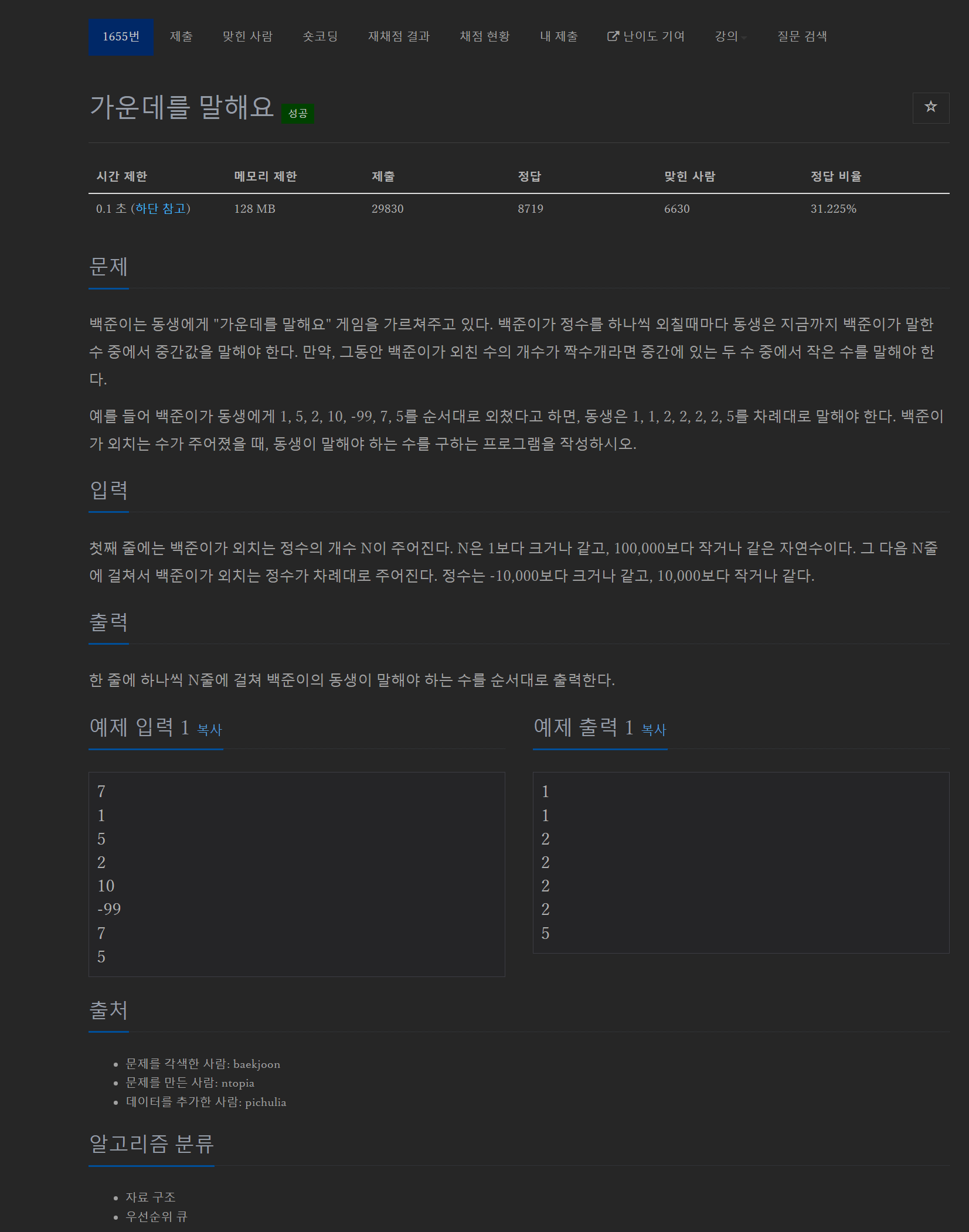 [BOJ - JAVA] 1655 - 가운데를 말해요 (우선순위 큐) 본문