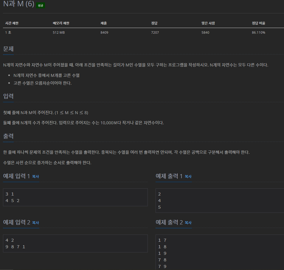 N개의 자연수와 자연수 M이 주어졌을 때, 아래 조건을 만족하는 길이가 M인 수열을 모두 구하는 프로그램을 작성하시오. N개의 자연수는 모두 다른 수이다. N개의 자연수 중에서 M개를 고른 수열