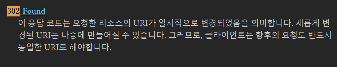 302 Found를 보시면 요청한 리소스의 URI가 일시적으로 변경되었다는 것을 의미한다고 나와있네요