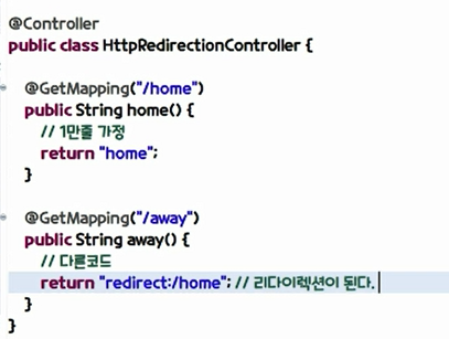 따라서 return할 때 return "redirect:/home"; 이렇게 입력하면 away를 실행하지 않고 home의 코드를 재사용하여 결과를 수행합니다.
