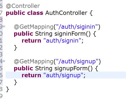 file을 return할 것이므로 @Controller어노테이션을 단 뒤 sigininForm()과 signupForm()을 만듭니다.