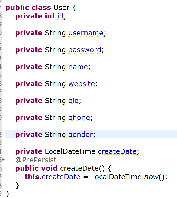 또한 private LocalDateTime의 createDate를 선언했는데 이 createDate는 @Prepersist 어노테이션을 걸었습니다.