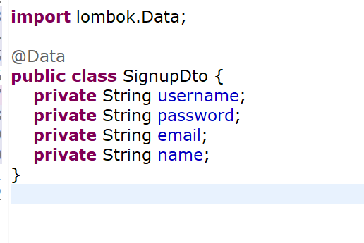 이렇게 적는데, Dto클래스는 위에 @Data라는 어노테이션을 걸면 좋습니다.
