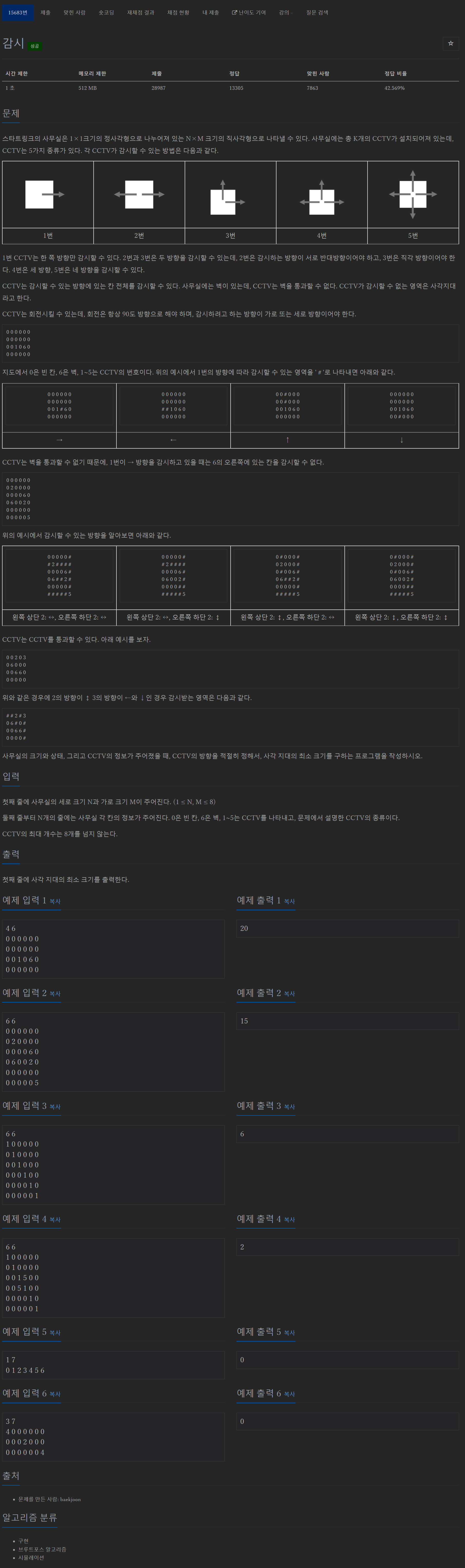 스타트링크의 사무실은 1×1크기의 정사각형으로 나누어져 있는 N×M 크기의 직사각형으로 나타낼 수 있다. 사무실에는 총 K개의 CCTV가 설치되어져 있는데, CCTV는 5가지 종류가 있다. 각 CCTV가 감
