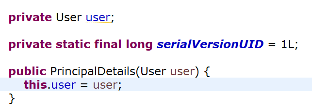 또한 PrincipalDetails 클래스로 돌아가보면 오류가 또 날텐데 그건 Getter,Setter가 없어서 그렇습니다.