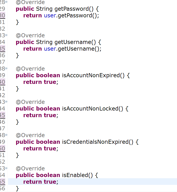 그리고 다음과 같이 바꿔주는데, getPassword()와 getUsername()은 return으로 저렇게 작성하면 됩니다.