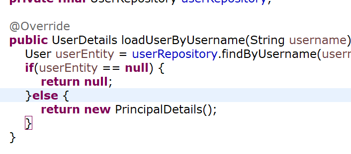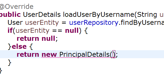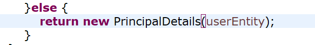 이후 PrincipalDetailsService로 돌아와서 return new PrincipalDetails로 고쳐줍니다.