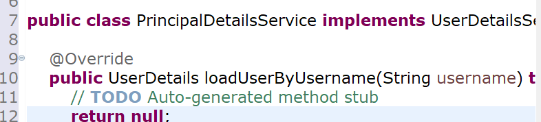 그리고 UserDetailsService를 implements하고 add unimplemented method를 눌러서 다음과 같이 작성합니다.