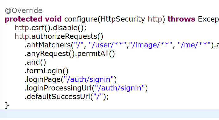 그래서 config패키지의 SecurityConfig클래스를 다음과 같이 바꿉니다.