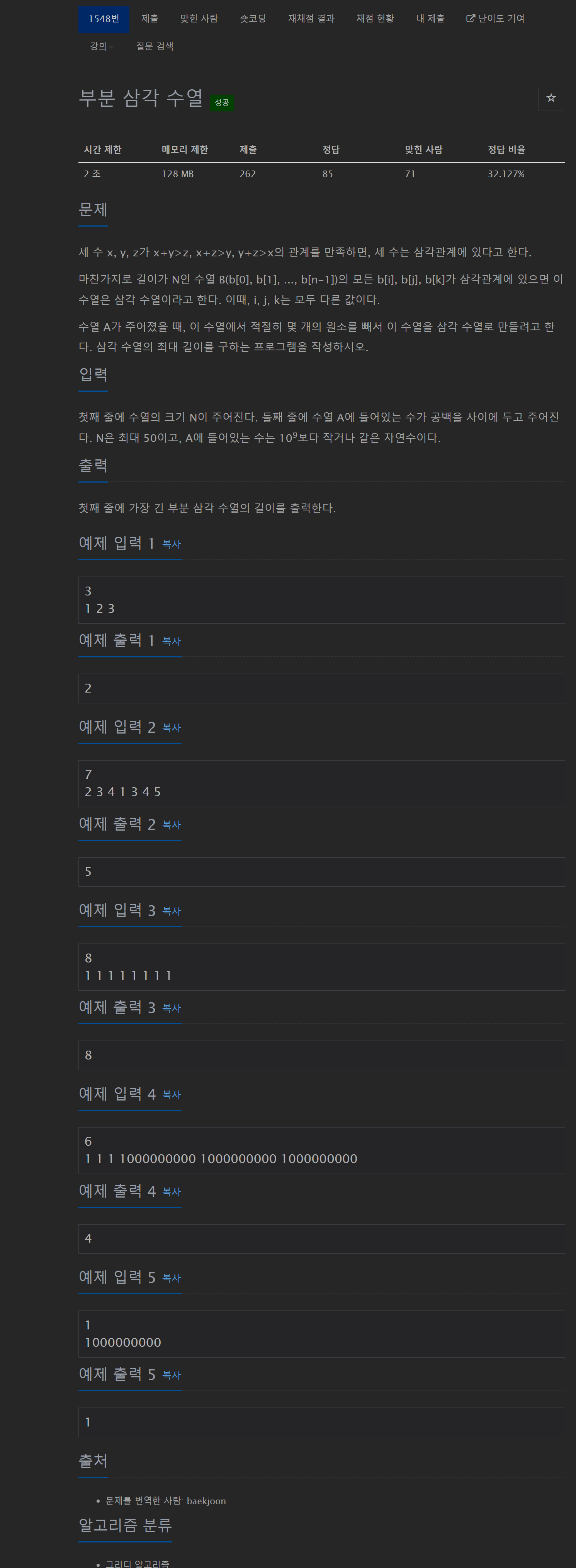 세 수 x, y, z가 x+y>z, x+z>y, y+z>x의 관계를 만족하면, 세 수는 삼각관계에 있다고 한다. 마찬가지로 길이가 N인 수열 B(b[0], b[1], ..., b[n-1])의 모든 b[i], b[j], b[k]가 삼각관계에 있으면 이 수열은 삼각