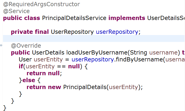 이후 PrincipalDetailsService내부에서 Username이 있는지 확인을 했었습니다.
