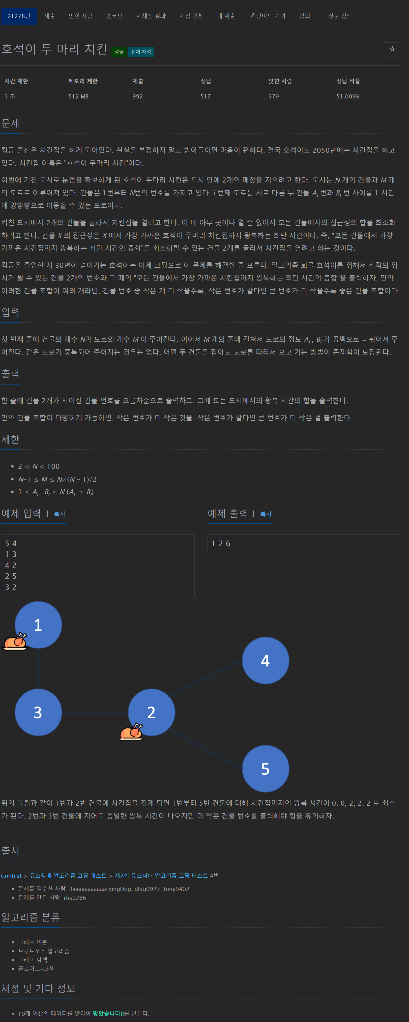 위의 그림과 같이 1번과 2번 건물에 치킨집을 짓게 되면 1번부터 5번 건물에 대해 치킨집까지의 왕복 시간이 0, 0, 2, 2, 2 로 최소가 된다. 2번과 3번 건물에 지어도 동일한 왕복 시간이 나오지만 더