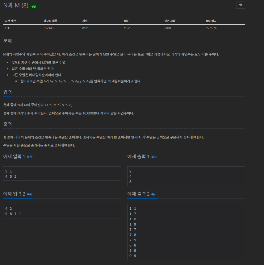 15657번: N과 M (8)