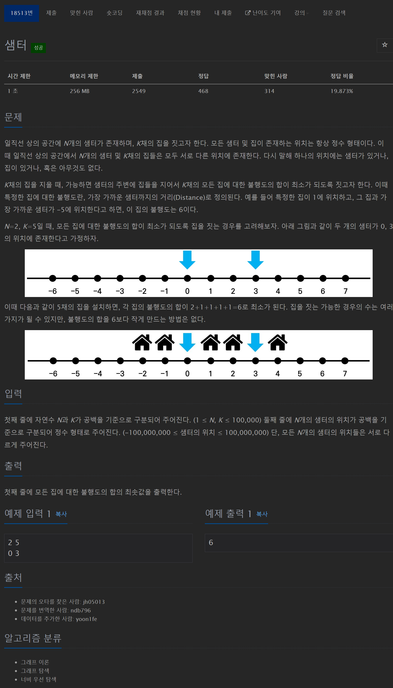 첫째 줄에 자연수 N과 K가 공백을 기준으로 구분되어 주어진다. (1 ≤ N, K ≤ 100,000) 둘째 줄에 N개의 샘터의 위치가 공백을 기준으로 구분되어 정수 형태로 주어진다. (-100,000,000 ≤ 샘터의 위치 ≤
