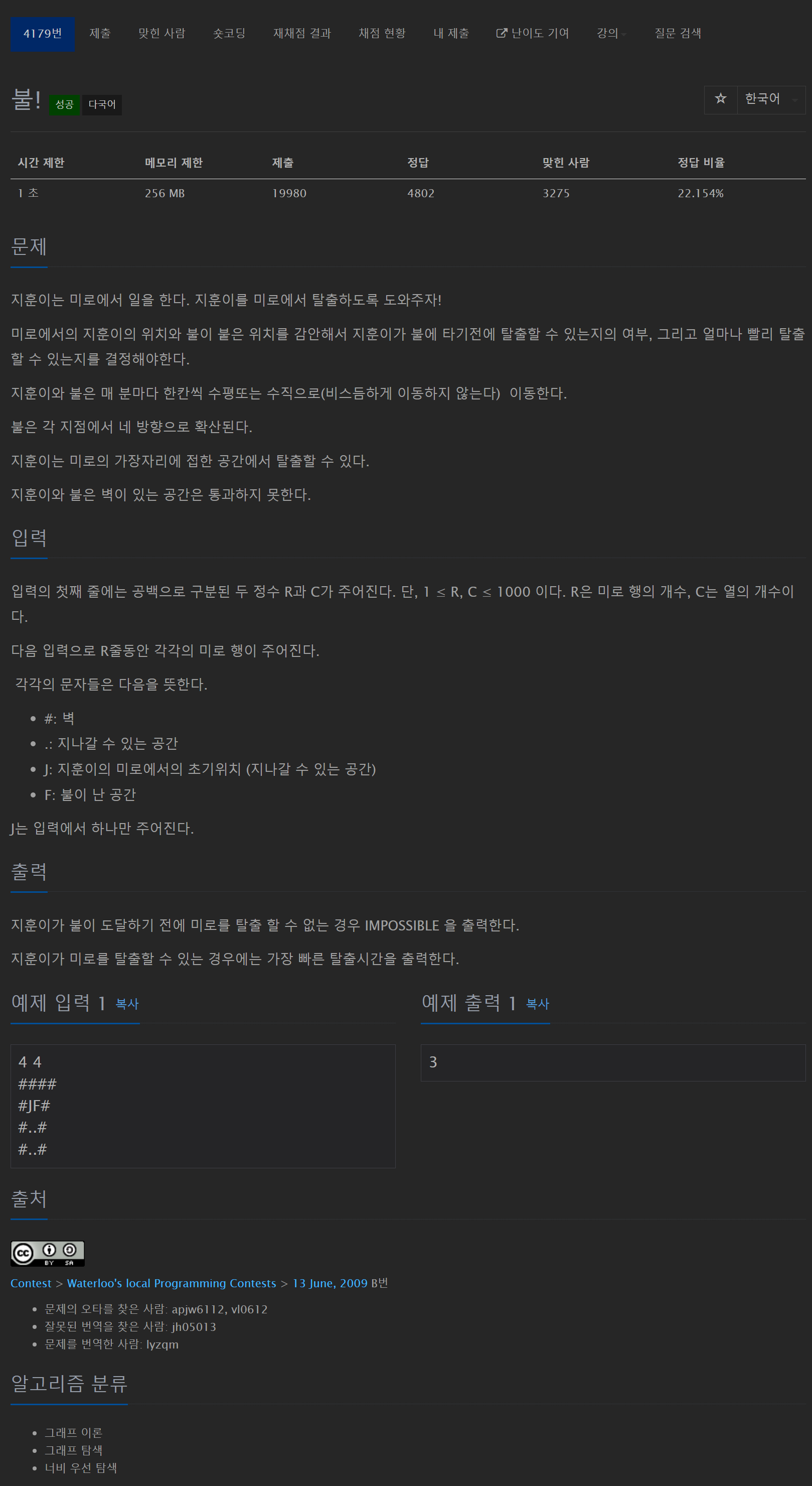 이 문제는 J는 주인공의 위치, F는 불이 발화한 위치를 뜻하고 #은 벽, .은 공간을 의미합니다.