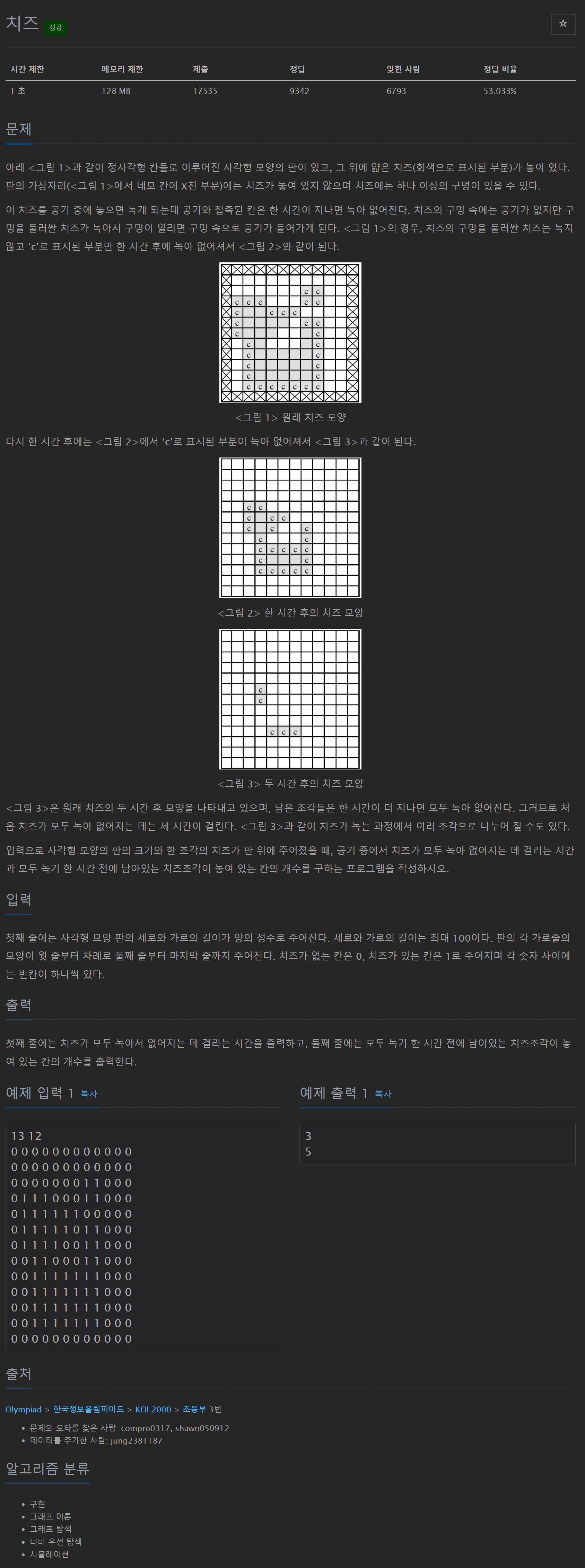 아래 <그림 1>과 같이 정사각형 칸들로 이루어진 사각형 모양의 판이 있고, 그 위에 얇은 치즈(회색으로 표시된 부분)가 놓여 있다. 판의 가장자리(<그림 1>에서 네모 칸에 X친 부분)에는 치즈가 놓