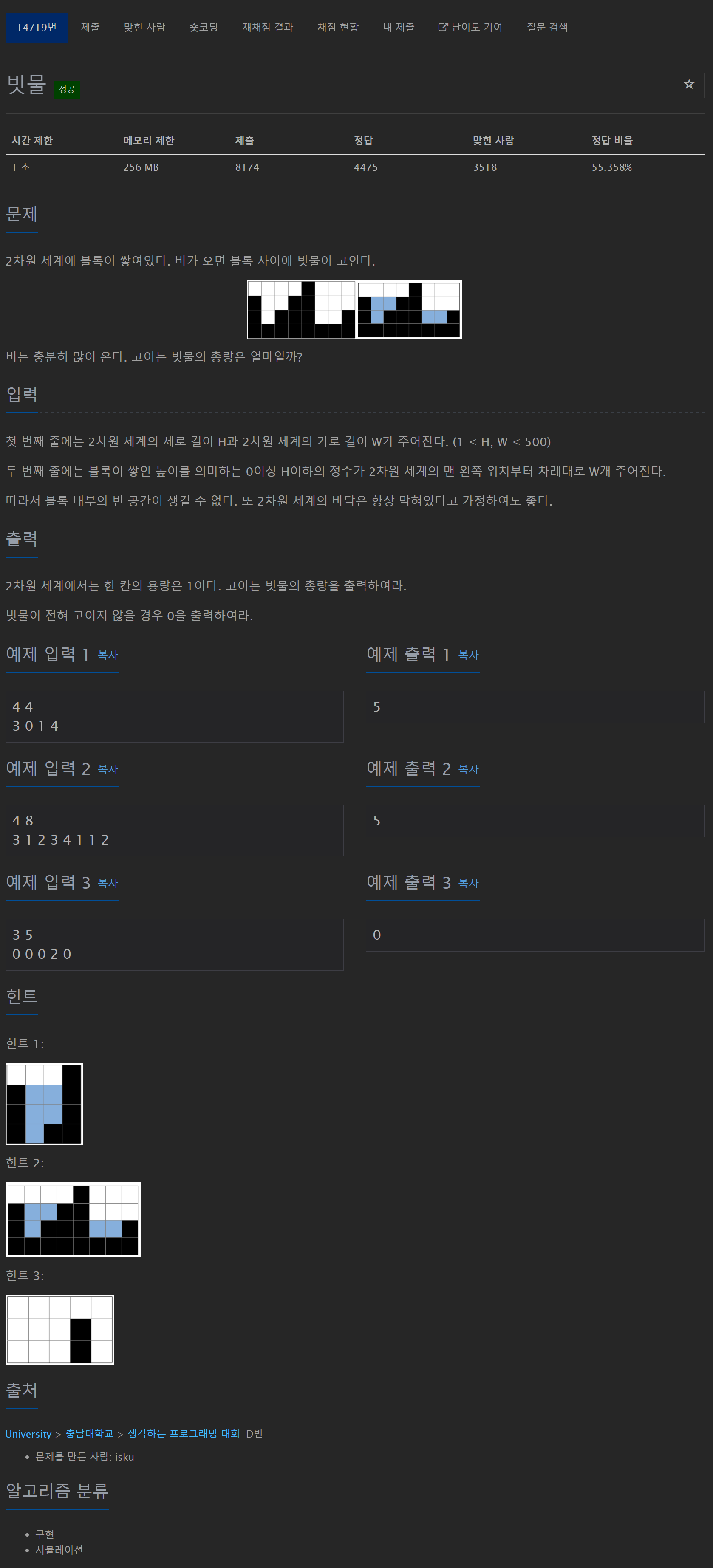 [BOJ - JAVA] 14719 - 빗물(시뮬레이션, 구현) 본문