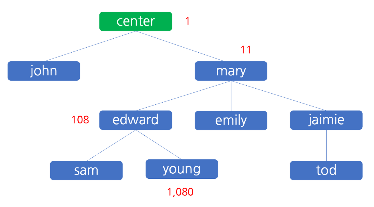 판매원 young 에 의하여 1,200 원의 이익이 발생했습니다. young 은 이 중 10% 에 해당하는 120 원을, 자신을 조직에 참여시킨 추천인인 edward 에게 배분하고 자신은 나머지인 1,080 원을 가집니다. edward 는 young 에게서 받은 120 원 중 10% 인 12 원을 mary 에게 배분하고 자신은 나머지인 108 원을 가집니다. 12 원을 edward 로부터 받은 mary 는 10% 인 1 원을 센터에 (즉, 민호에게) 배분하고 자신은 나머지인 11 원을 가집니다. 이 상태를 그림으로 나타내면 아래와 같습니다.