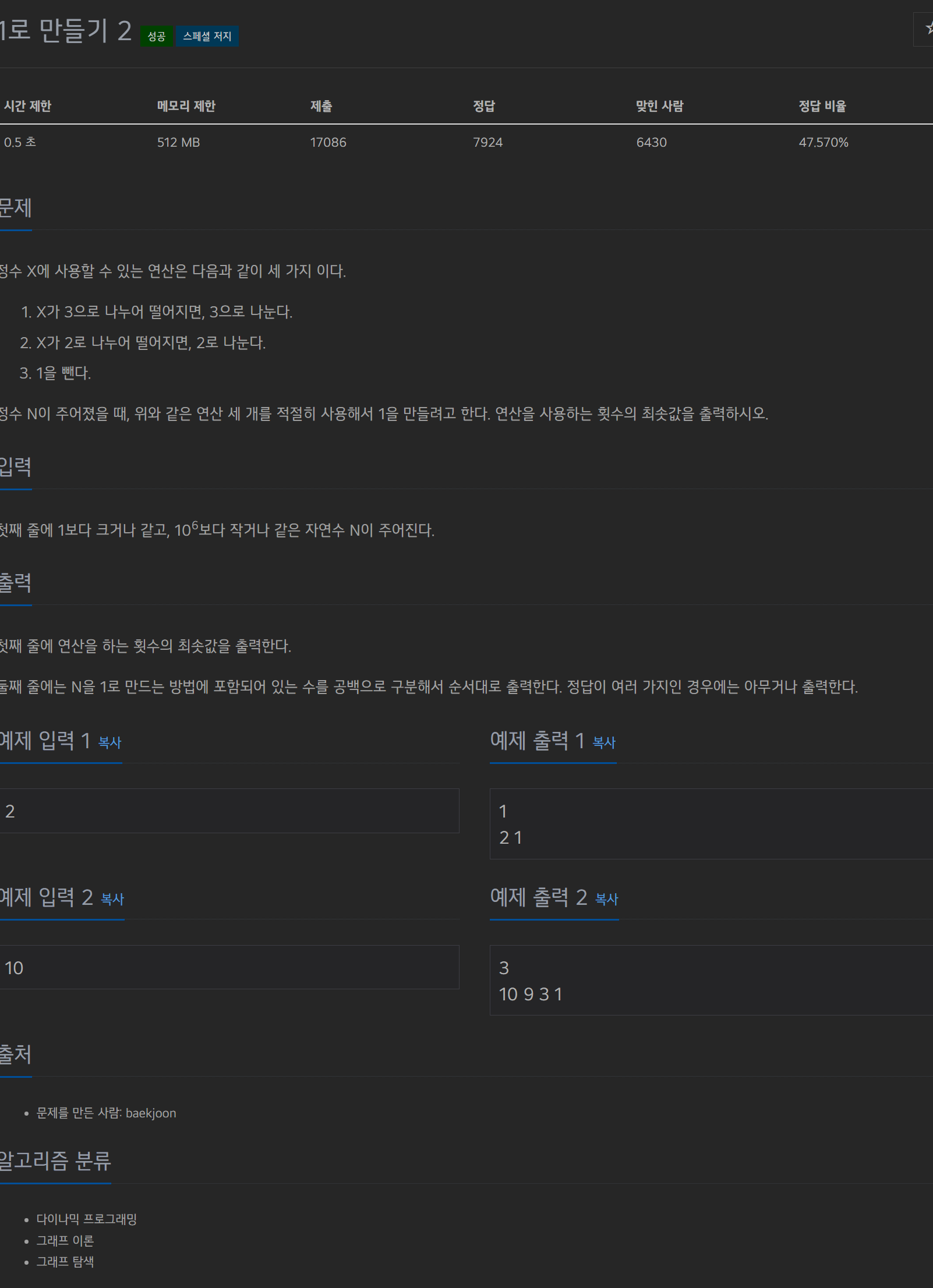 N에서부터 1까지 역추적 하기 위해 3으로 나누어 떨어지면 현재의 dp[i] + 1, dp[i/2]중 최솟값을 dp[i/3]에 담고 2로 나누어 떨어지면 dp[i] + 1, dp[i/2]중 최솟값을 담았습니다.