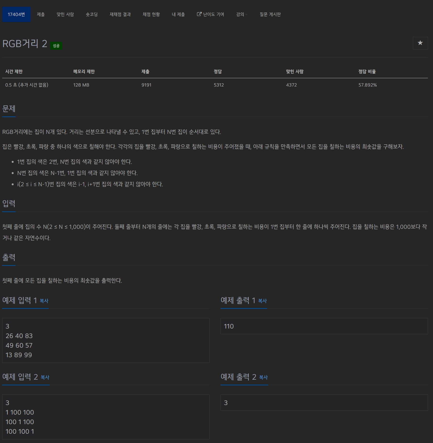 [BOJ - JAVA] 17404 - RGB 거리 2 (다익스트라, DP) 본문