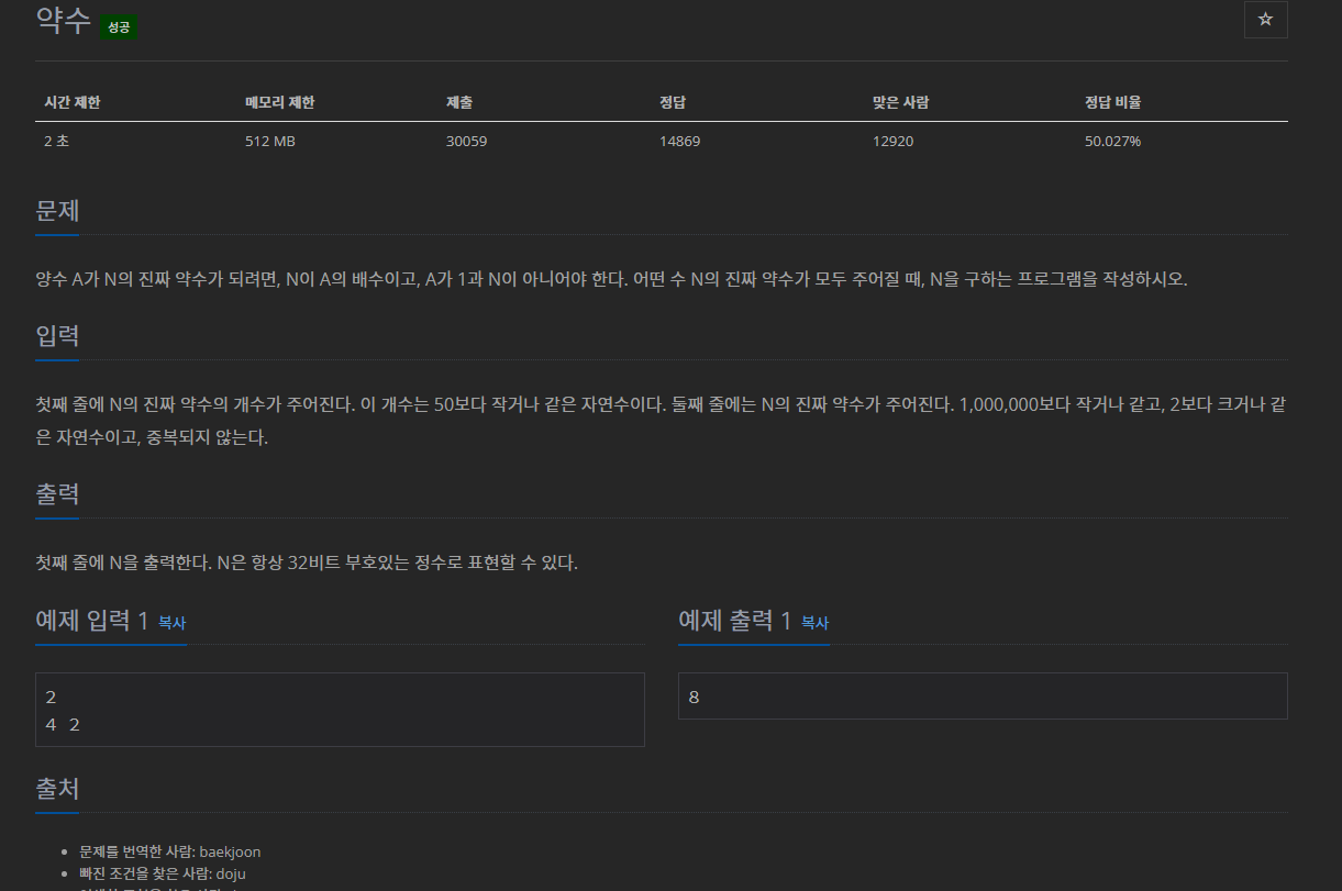첫째 줄에 N의 진짜 약수의 개수가 주어진다. 이 개수는 50보다 작거나 같은 자연수이다. 둘째 줄에는 N의 진짜 약수가 주어진다. 1,000,000보다 작거나 같고, 2보다 크거나 같은 자연수이고, 중복되