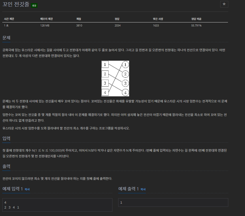 여기서 의문이 드실 수 있습니다. '꼬인 전깃줄'문제인데 왜 증가하는 부분수열 개념이 들어가는지를요.