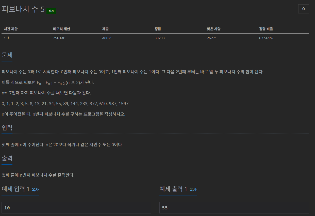 피보나치 수는 0과 1로 시작한다. 0번째 피보나치 수는 0이고, 1번째 피보나치 수는 1이다. 그 다음 2번째 부터는 바로 앞 두 피보나치 수의 합이 된다. 이를 식으로 써보면 Fn = Fn-1 + Fn-2 (n ≥ 2)가