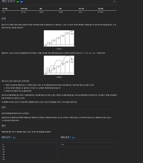 계단 오르기 게임은 계단 아래 시작점부터 계단 꼭대기에 위치한 도착점까지 가는 게임이다. <그림 1>과 같이 각각의 계단에는 일정한 점수가 쓰여 있는데 계단을 밟으면 그 계단에 쓰여 있는 점
