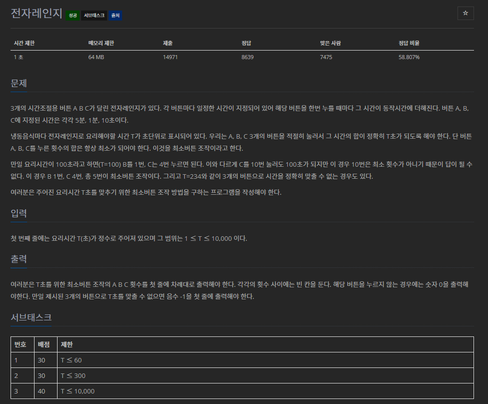 [BOJ - JAVA] 10162 - 전자레인지(그리디 알고리즘) 본문