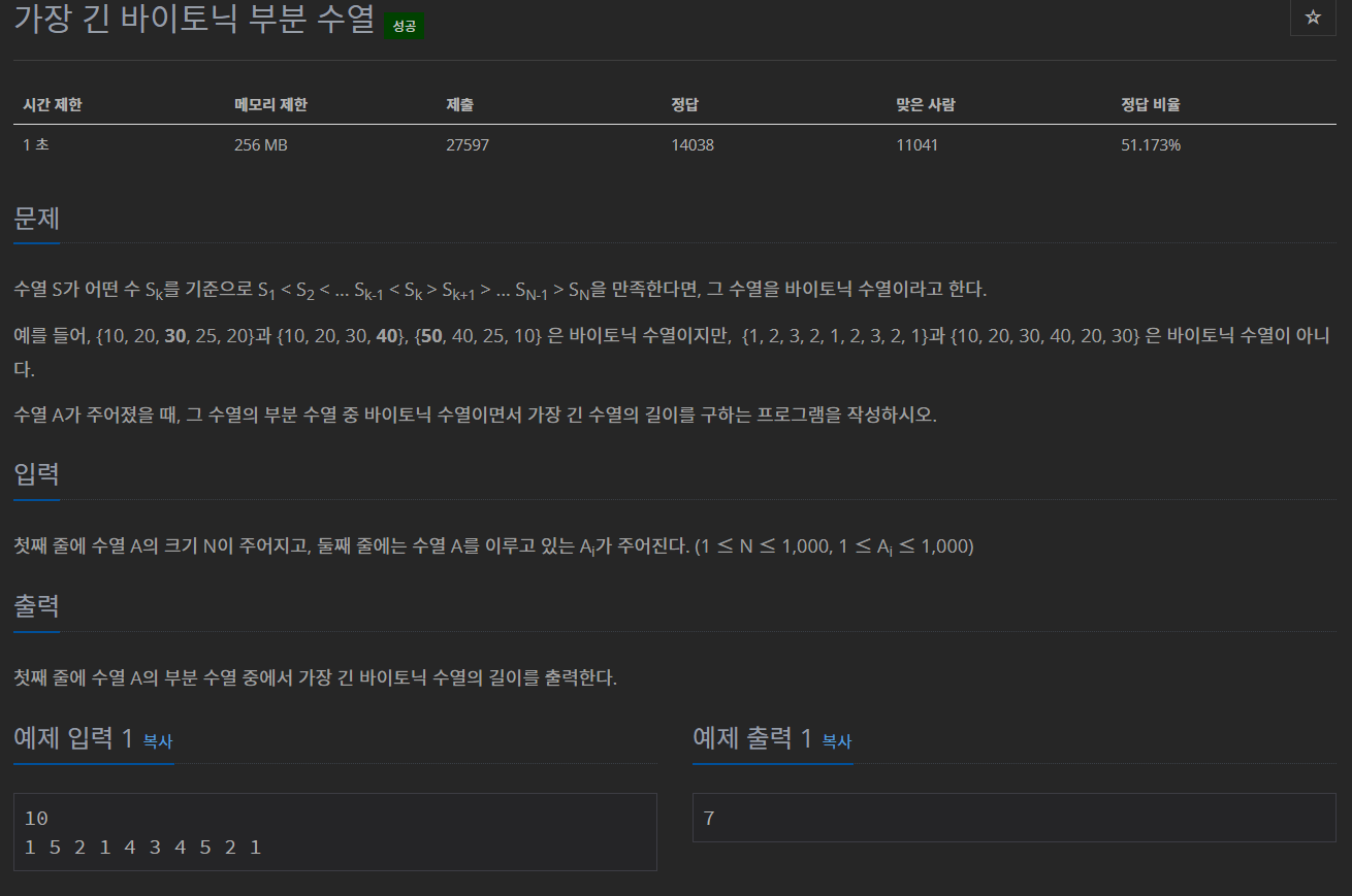[BOJ - JAVA] 11054 - 가장 긴 바이토닉 부분 수열(LIS, LDS, DP) 본문