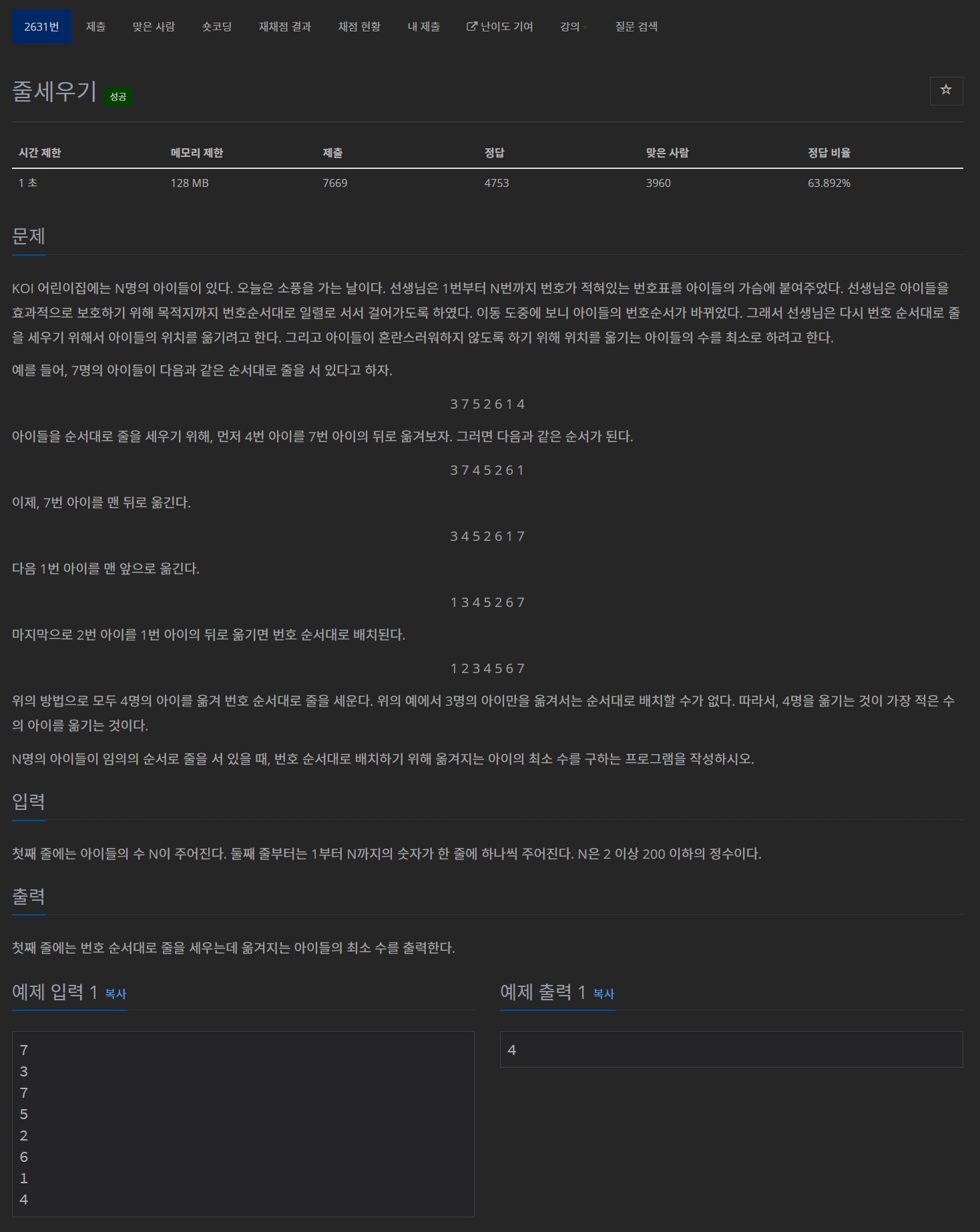 또한 예제를 잘 보시면 예제에서 힌트를 주고 있습니다. 잘 보시면 4, 7, 1, 2만 움직이고 있습니다. 이 숫자들을 제외하고 보면 3,5,6만그대로 있는데 이는 3,5,6이 LIS이고 전체 숫자 7개에서 3개를 빼면 그것이 이동횟수임을 알려주고 있습니다.