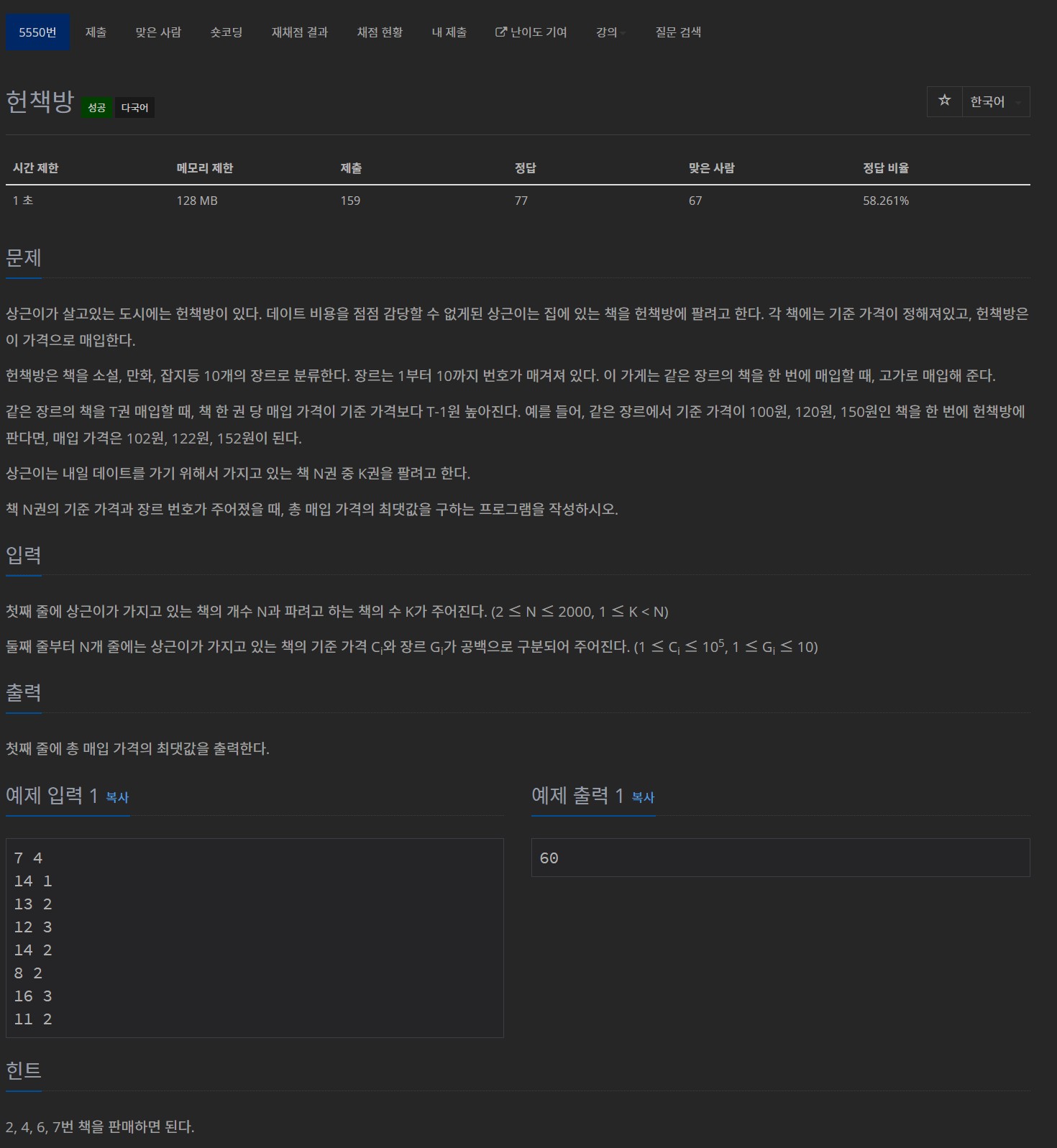 상근이가 살고있는 도시에는 헌책방이 있다. 데이트 비용을 점점 감당할 수 없게된 상근이는 집에 있는 책을 헌책방에 팔려고 한다. 각 책에는 기준 가격이 정해져있고, 헌책방은 이 가격으로