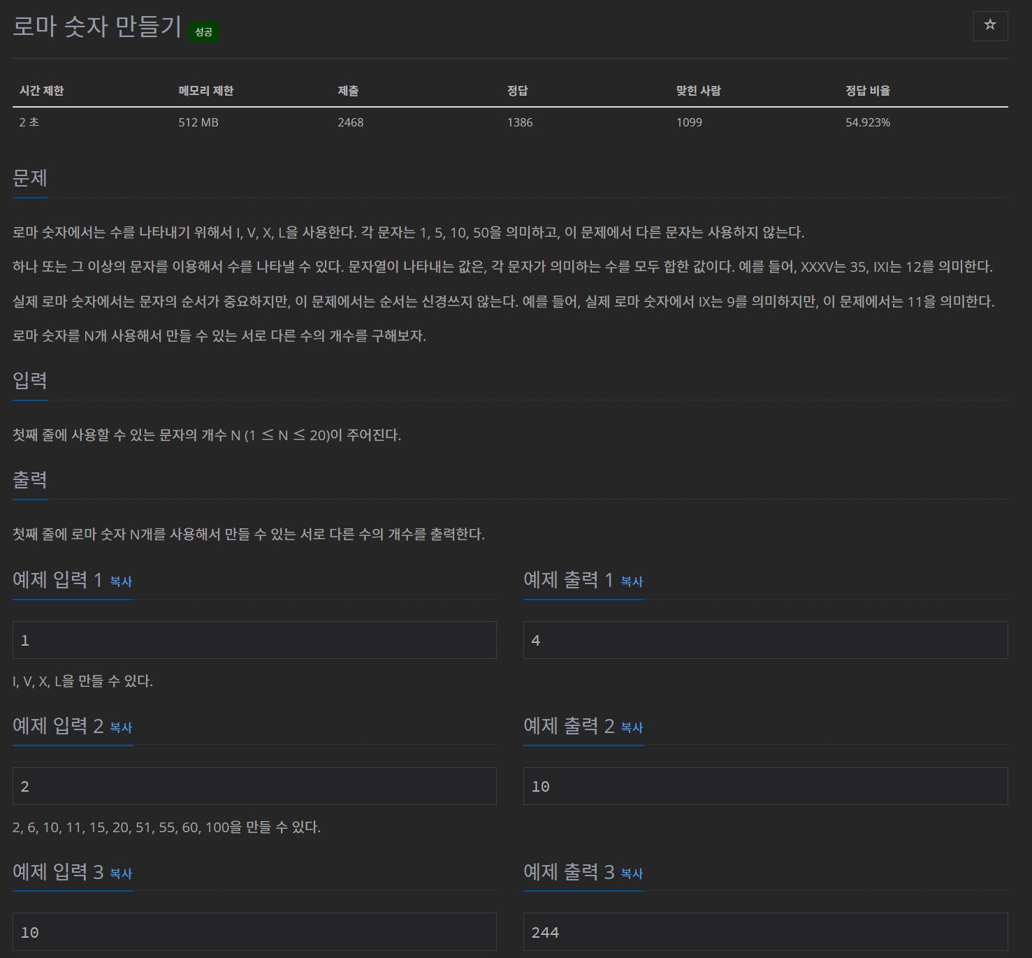 [BOJ - JAVA] 16922 - 로마 숫자 만들기(DP, 조합) 본문