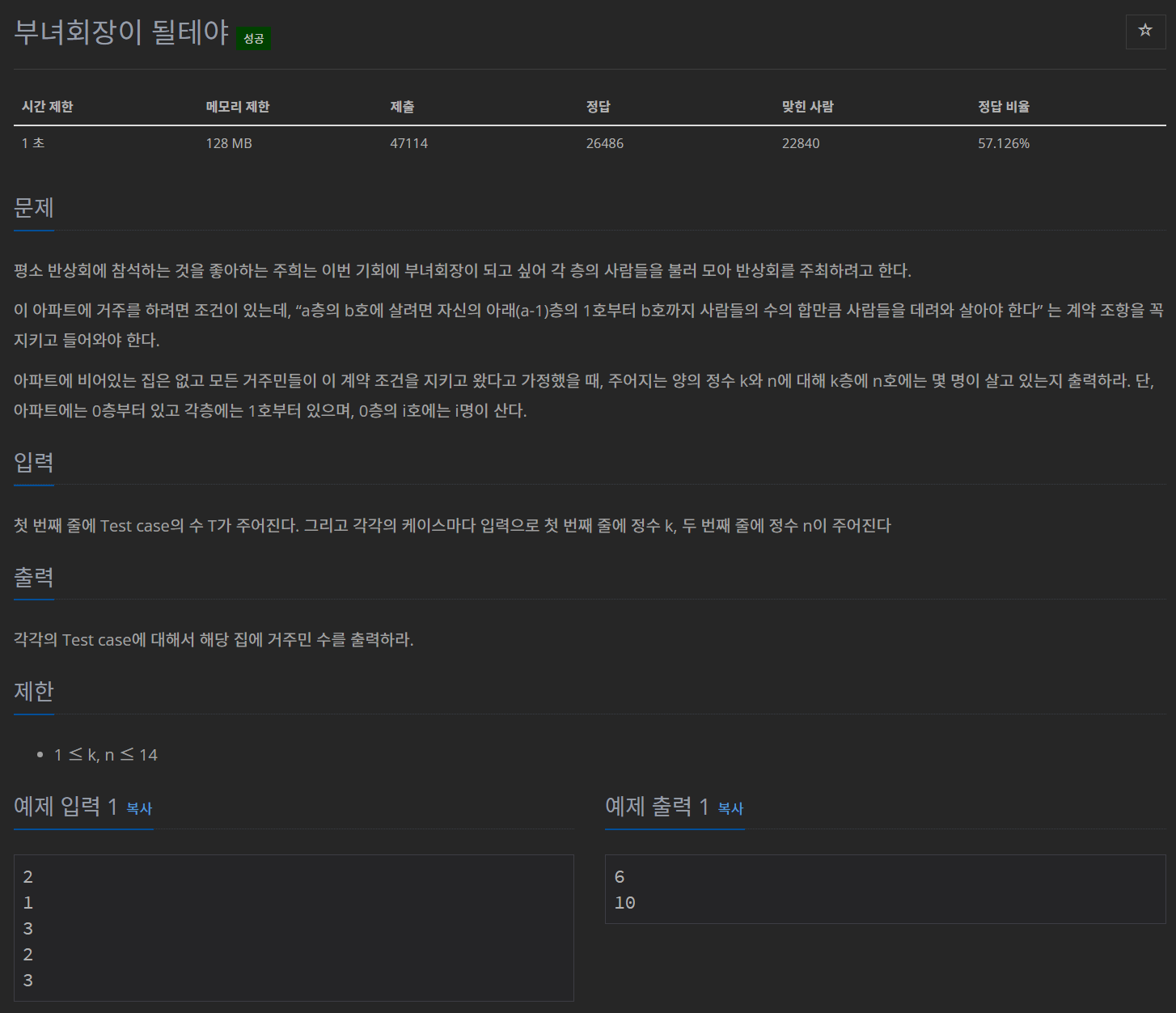 [BOJ - JAVA] 2775 - 부녀회장이 될테야(수학, DP) 본문