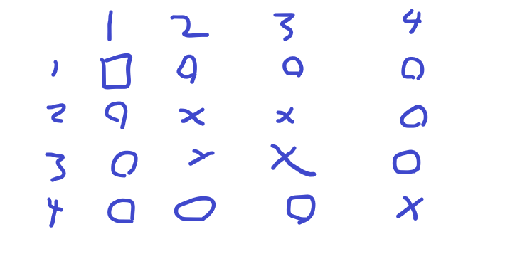이후 (1,2)와 (2,1), (1,3)과 (3,1), (1,4)와 (4,1), (2,4)와 (4,2), (3,4)와 (4,3)은 모두 1로 현재 입력되어 있는 상태죠?