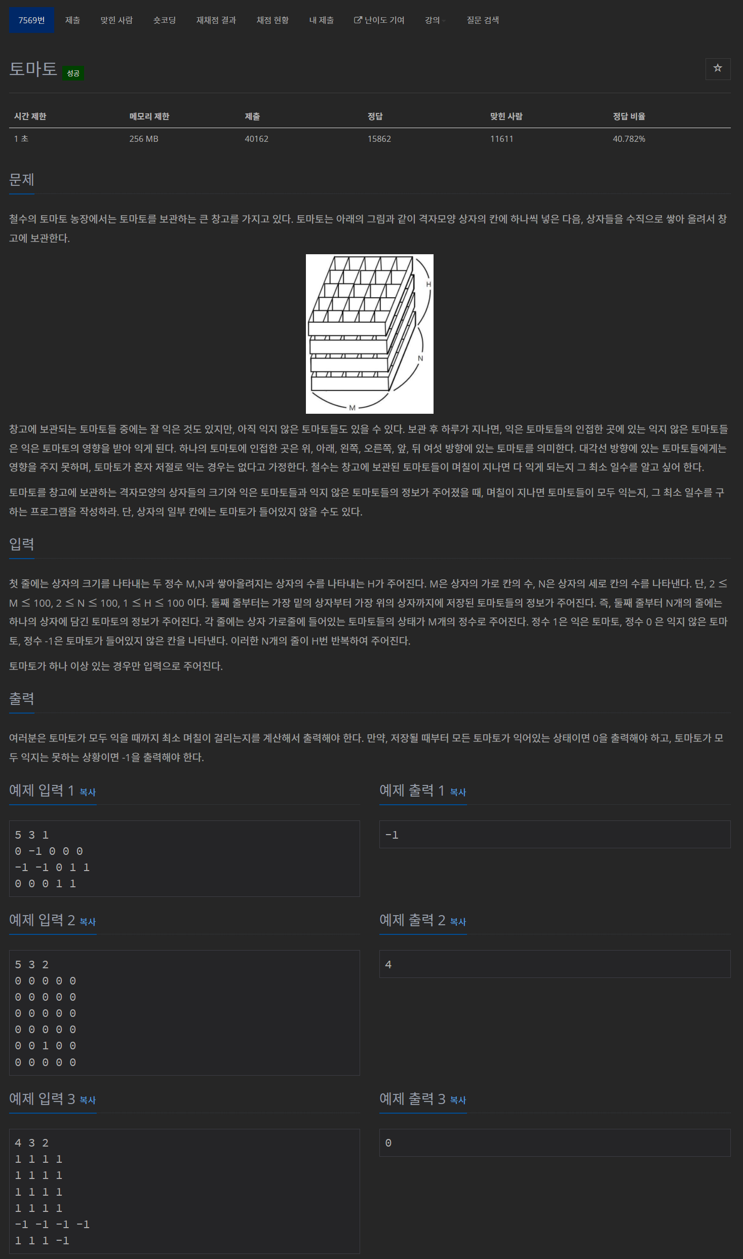 # 주소 https://www.acmicpc.net/problem/7576 7576번: 토마토 첫 줄에는 상자의 크기를 나타내는 두 정수 M,N이 주어진다. M은 상자의 가로 칸의 수, N은 상자의 세로 칸의 수를 나타낸다. 단, 2 ≤ M,N ≤ 1,000..
