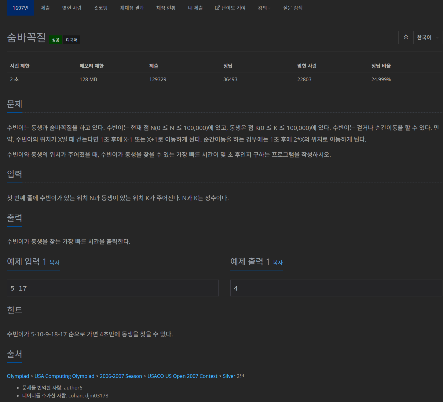 이번에 소개할 문제는 숨바꼭질입니다. 정답률이 24%밖에 안되서 왜지... 했는데 생각보다 코드는 간결한데 섬뜩 생각하기 어려운 부분이 많더라고요.